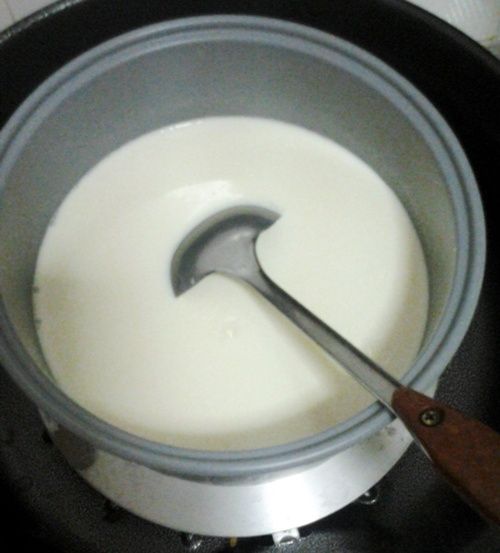 1) Panaskan susu dalam periuk, sentiasa kacau supaya susu tak hangus dalam dasar periuk. Kacau sampai susu mendidih.